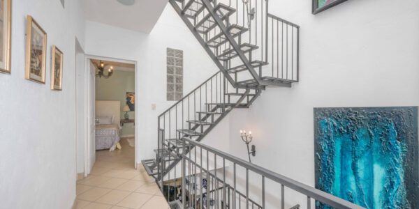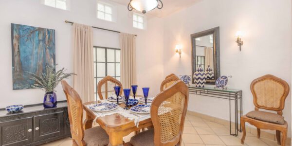 The living areas are equally enchanting. A charming reading nook tucked beneath a dramatic metal staircase provides a quiet escape, with natural light, greenery, and a handwoven rug that adds a splash of color and texture. The dining room is ideal for entertaining, with elegant lighting, cane-back chairs, and a cohesive palette of blue and natural wood tones that continue the home’s artisan-inspired design.