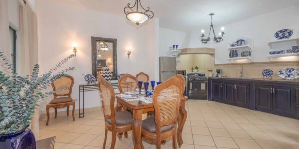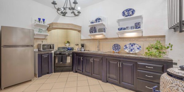 Step inside and be greeted by a warm and inviting traditional Mexican kitchen, featuring dark wood cabinetry, artisanal tile backsplash, and a built-in plate rack accented by Talavera dishware. A wrought iron chandelier and open shelving give this space a cozy, timeless appeal.