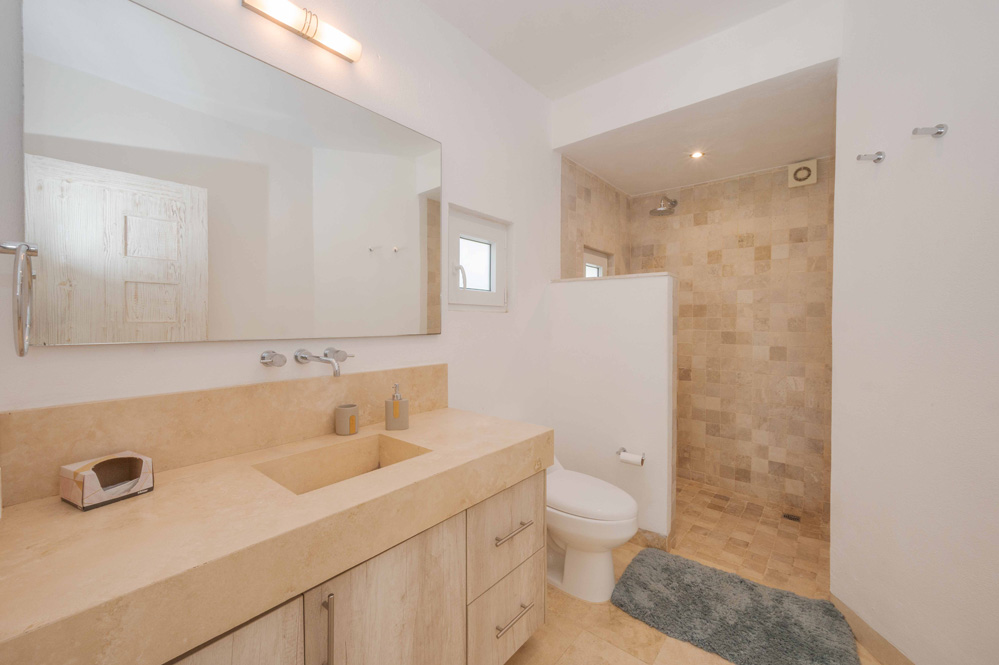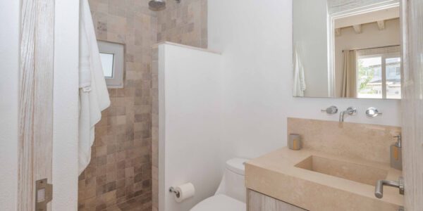 The home features an open-plan kitchen and living area that conveniently includes the laundry room. All three bedrooms offer en-suite bathrooms and mini-split air conditioning units; one is located on the street level, adding exceptional convenience. Both the street-level bedroom and the living area (also equipped with a mini-split) enjoy serene views of the stream bed.