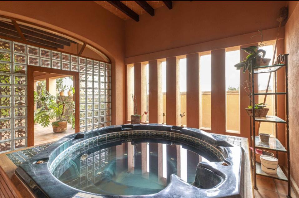 The house features 3 bedrooms, 2 full bathrooms, 2 half baths, a living and dining room with a stunning barrel-vaulted ceiling, as well as several terraces to enjoy the view. There’s also a TV room/home office, a spacious kitchen with scenic views, a lush patio filled with plants, a jacuzzi room, full-service quarters, a laundry room, and an ironing room.