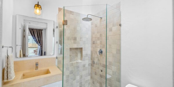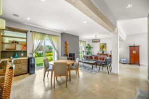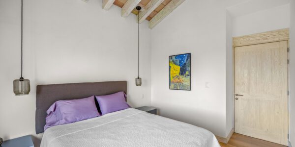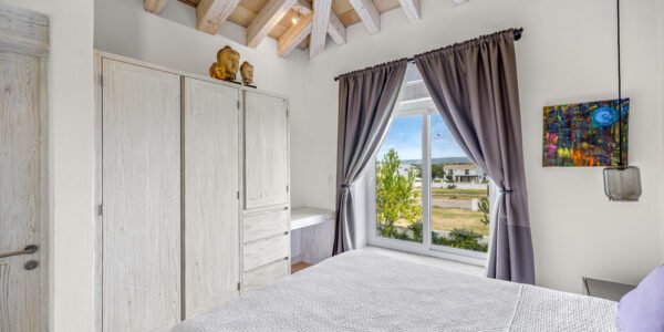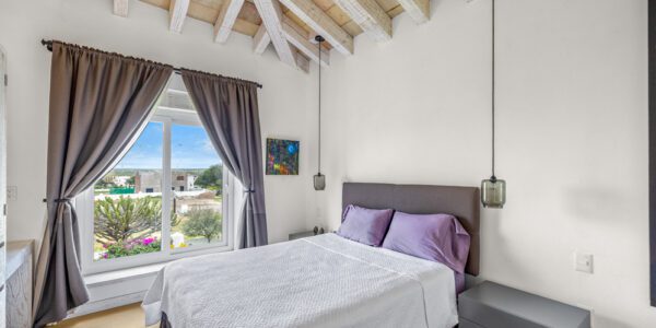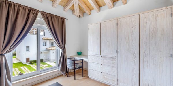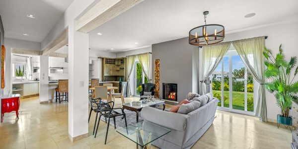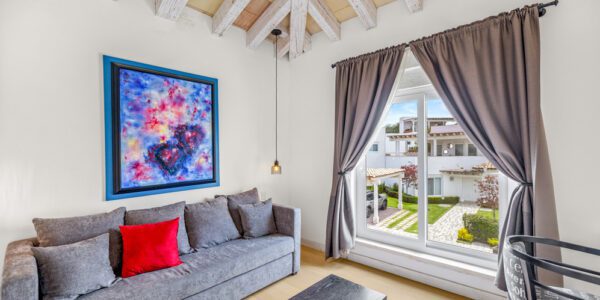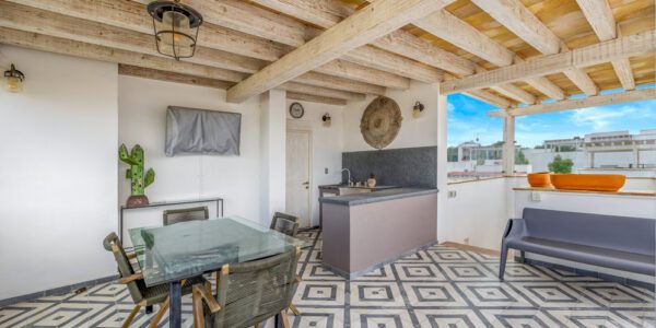 The house has three bedrooms, each with an en-suite bathroom. Upon entering the open-plan living area, where the kitchen is part of the same space, the white-stained wooden beams and ceilings create the feeling of an even larger space, thanks to their high ceilings and the opening to the rear garden.
