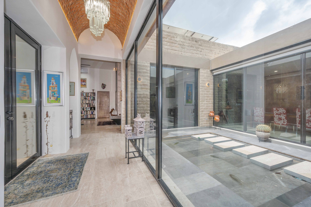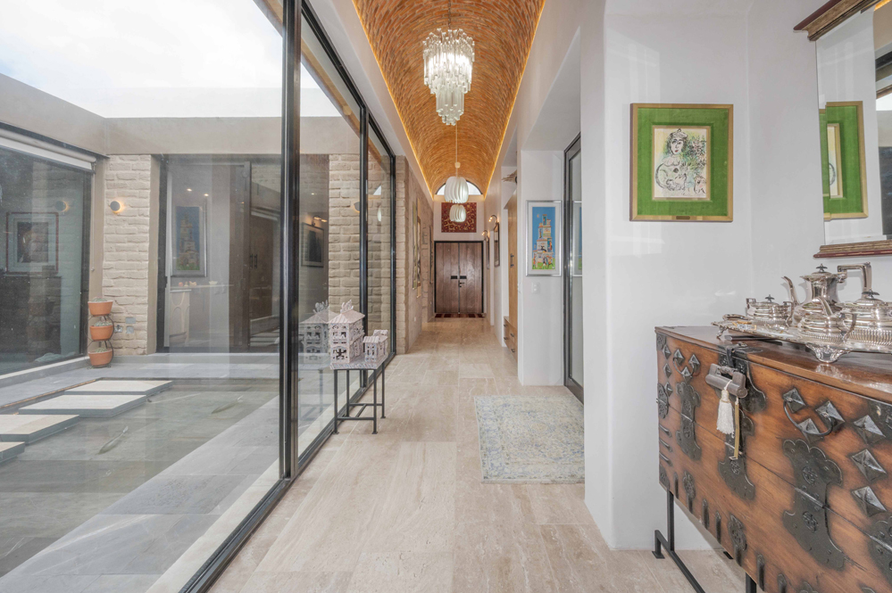 Senderos de concreto visto conducen a través de una puerta de hierro hacia unas euforbios gigantes (cactáceas y suculentas) hasta la entrada principal: dos puertas de cristal reflectante de 2,6 metros de altura. En el interior, un pasillo con galería coronado por una bóveda de ladrillo se abre a una amplia vista del estanque reflectante del patio.