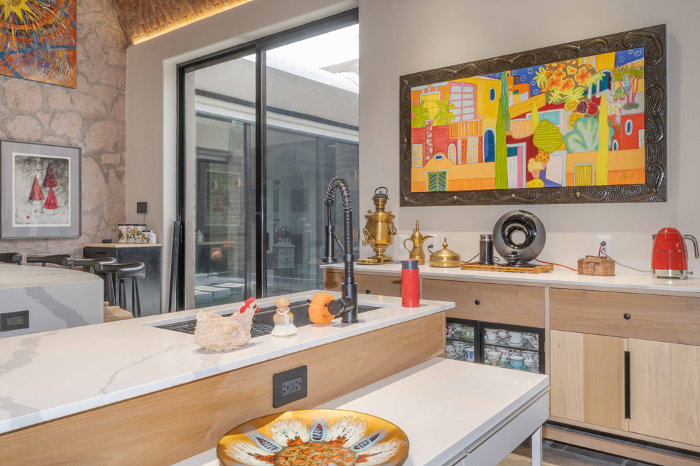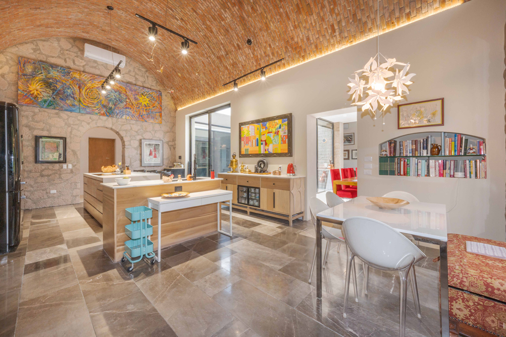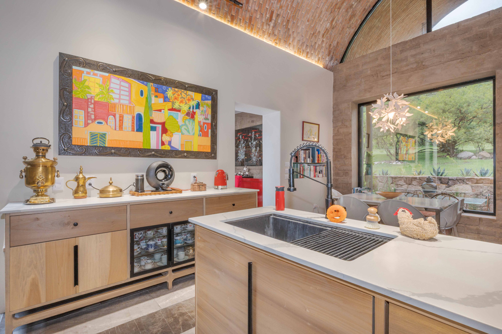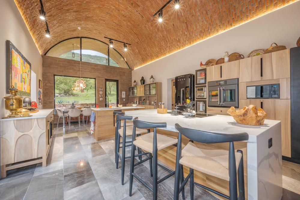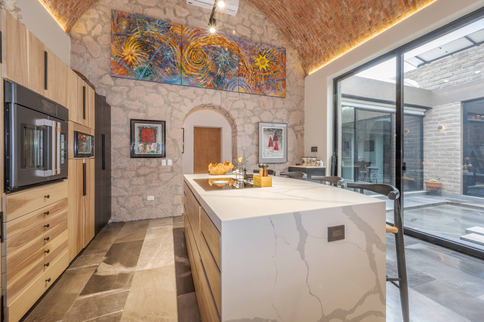 A soaring five-meter-high bóveda ceiling crowns the kitchen and an arched window reveals a natural rock outcropping. Six custom poplar cabinets define cooking, storage, and dining zones, while a walk-in pantry with grocery pass-through connects discreetly to the garage.