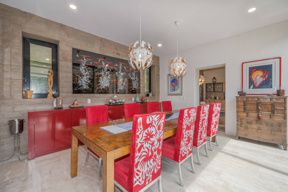 The dining room, lit by glass walls along the reflecting pool, features dual chandeliers and a lacquer buffet over four meters long. A stone wall separates it from the living room, where a dramatic glass wall frames mountain views. From here, a glass door opens to a furnished patio Sliding glass doors border the reflecting pool patio, while another wall displays art. A circular see-through gas fireplace in a stone wall links the living room and library.