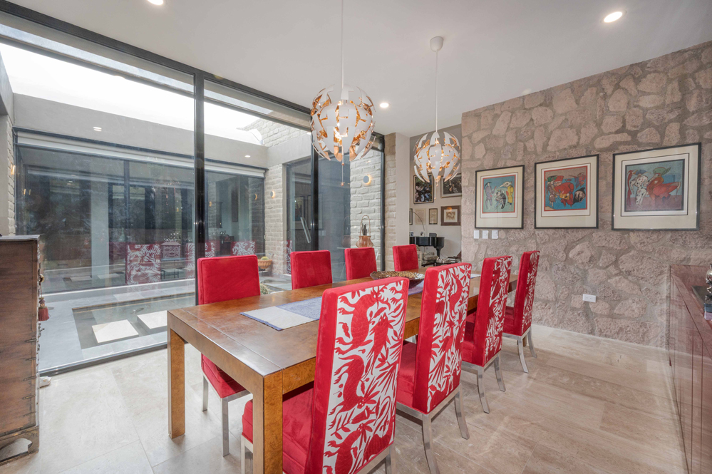 Muro de cristal de tres metros de altura encierra el patio, conectando el pasillo, la cocina, el comedor y la sala de estar con luz, aire y agua.