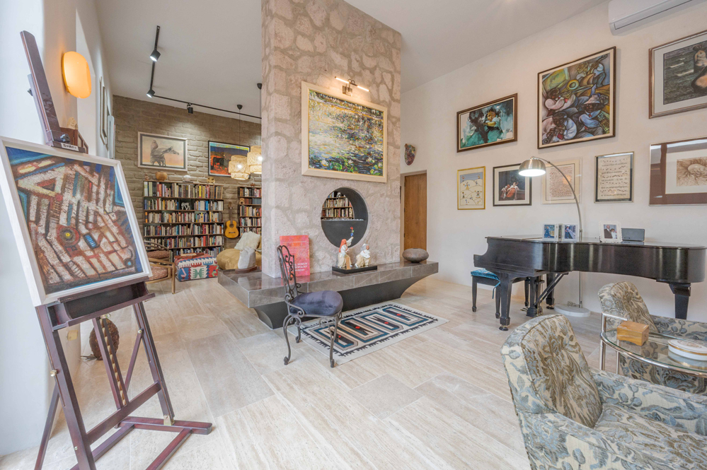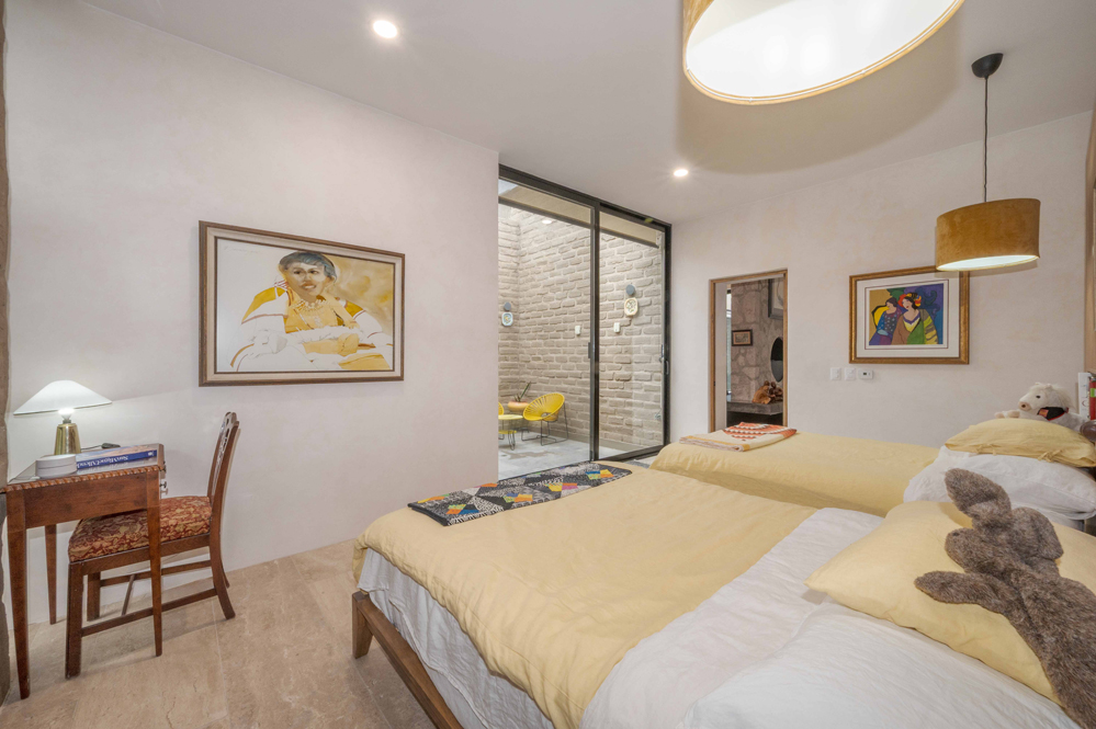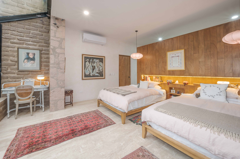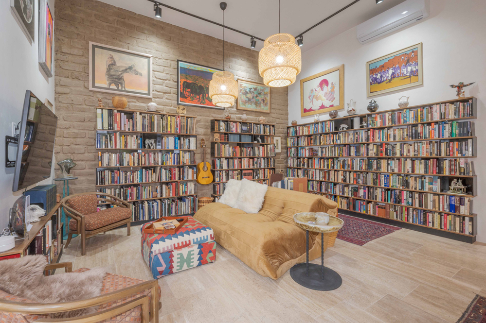 La biblioteca cuenta con estanterías, un sofá y un televisor de 55 pulgadas. Las altas paredes ofrecen espacio para exhibir obras de arte. Una puerta da paso a la Sala Amanecer, una suite de invitados en tonos dorados con dos camas matrimoniales, baño con inodoro inteligente y ducha con azulejos de piedra y mosaicos de pasta de mediados de siglo.