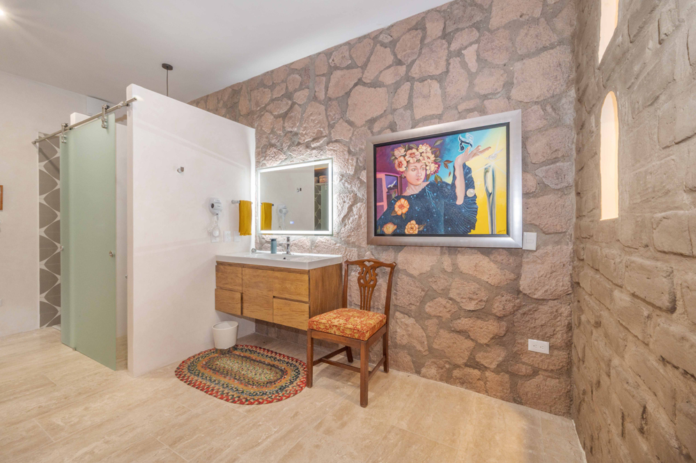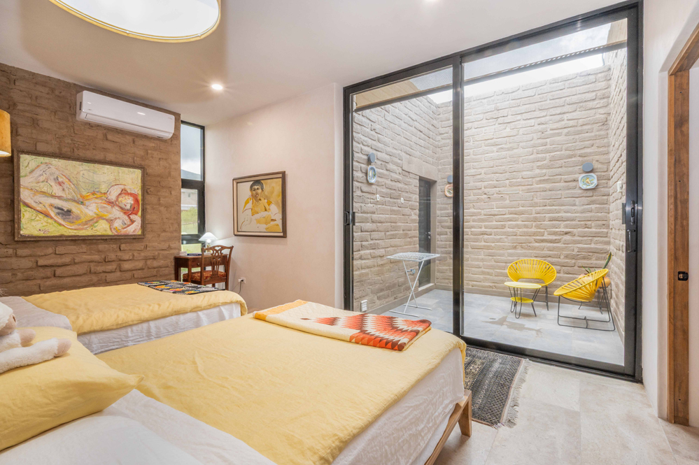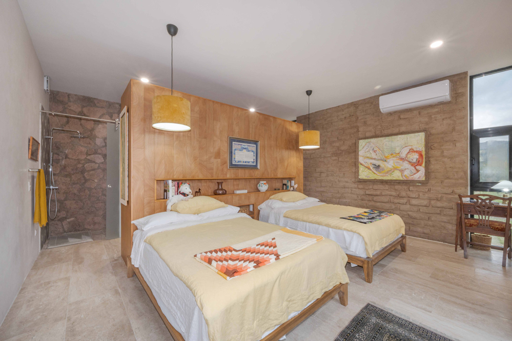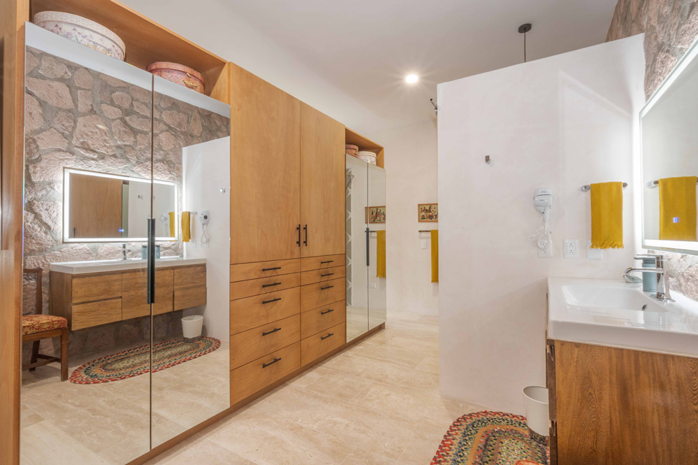 La suite principal, la Sala Atardecer, presenta una relajante paleta de rosas e incluye dos camas matrimoniales. Cinco metros de ventanas orientadas al oeste se inclinan hacia arriba para enmarcar las vistas celestiales y a la montaña. El baño incluye un inodoro inteligente y una ducha con mosaicos de pasta de mediados de siglo. Una oficina privada con paredes de adobe, techo de tejamanil y vistas a la montaña, se encuentra junto a la suite.
