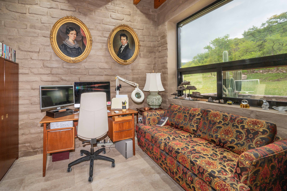 Throughout the home, thick adobe and stone walls and double-pane reflective tempered glass windows regulate temperature, aided by six Mini Split Mirage Inverters (five 24,000 BTU and one 18,000 BTU). Twelve solar panels with batteries and inverters supply a 280 amp-hour 48-volt system. Propane powers the Bosch three-zone radiant floor system in the bedroom, ensuite, laundry, and office wing, as well as two Rheem solar water systems, the Samsung dryer, and the see-through fireplace.