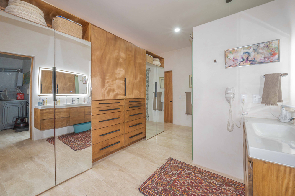 En el extremo opuesto del pasillo se encuentra una segunda oficina con techo de tejamanil y vistas al patio, junto a un baño donde una cómoda morijang coreana sirve de armario. Un tocador con lavabo de piedra negra y un inodoro Toto. Las puertas dobles se abren al garaje y a una sala de máquinas que alberga el calentador de agua, el sistema de filtración y el equipo solar.