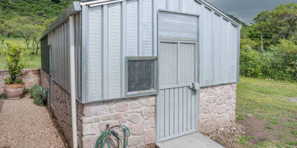 En el lado oeste, tres patios conectados se extienden a lo largo de la casa. El patio de la cocina, protegido por una extensión de su techo de bóveda, incluye una salida de gas para una parrilla. Junto a él, un gallinero alberga un gallo y dos gallinas que duermen y ponen huevos en su interior, pero pasan el día buscando comida al sol. Los patios de la sala y el comedor están sombreados por toldos de lona tejida.