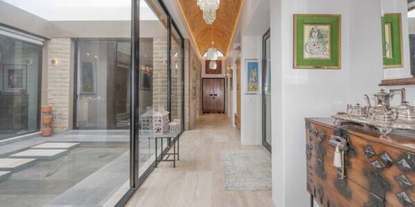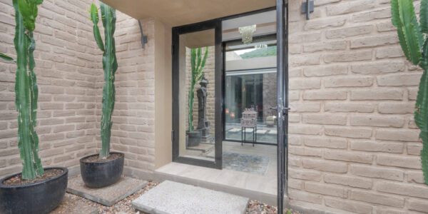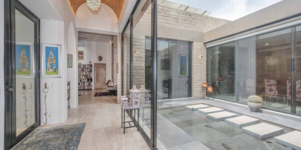 Senderos de concreto visto conducen a través de una puerta de hierro hacia unas euforbios gigantes (cactáceas y suculentas) hasta la entrada principal: dos puertas de cristal reflectante de 2,6 metros de altura. En el interior, un pasillo con galería coronado por una bóveda de ladrillo se abre a una amplia vista del estanque reflectante del patio.