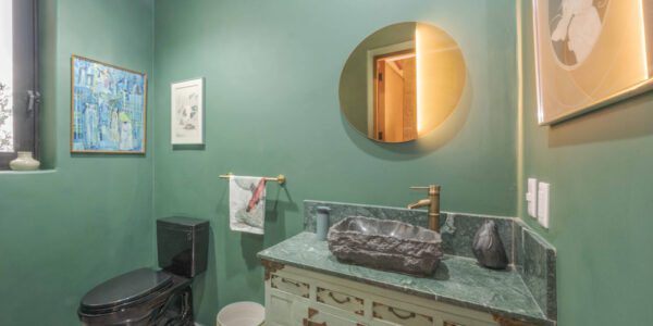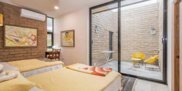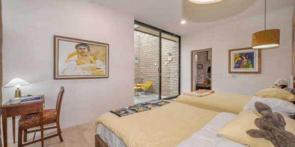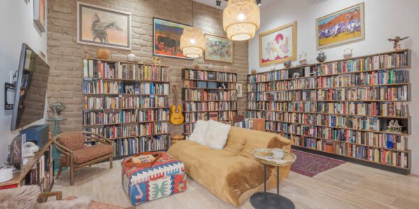 La biblioteca cuenta con estanterías, un sofá y un televisor de 55 pulgadas. Las altas paredes ofrecen espacio para exhibir obras de arte. Una puerta da paso a la Sala Amanecer, una suite de invitados en tonos dorados con dos camas matrimoniales, baño con inodoro inteligente y ducha con azulejos de piedra y mosaicos de pasta de mediados de siglo.