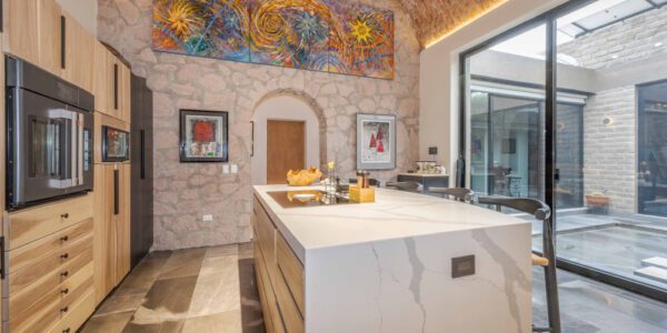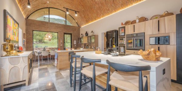 A soaring five-meter-high bóveda ceiling crowns the kitchen and an arched window reveals a natural rock outcropping. Six custom poplar cabinets define cooking, storage, and dining zones, while a walk-in pantry with grocery pass-through connects discreetly to the garage.