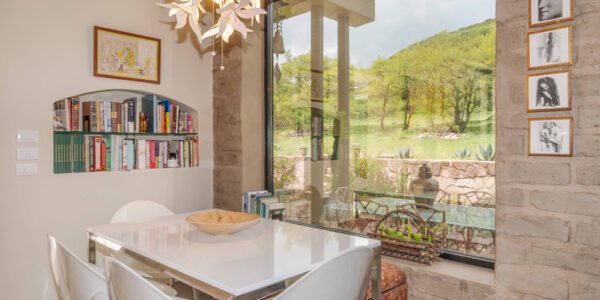 Un imponente techo de bóveda de cinco metros de altura corona la cocina y una ventana arqueada revela un afloramiento rocoso natural. Seis armarios de álamo a medida definen las zonas de cocina, almacenamiento y comedor, mientras que una despensa con acceso directo para comestibles se conecta discretamente con el garaje.