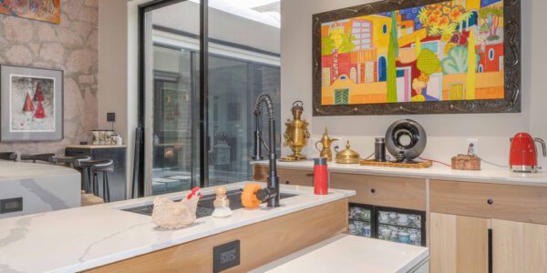 Los electrodomésticos incluyen un refrigerador SMEG, un lavavajillas Smeg integrado, microondas Samsung y un horno Café de puerta francesa. Una placa de inducción Elica Nikola Tesla se integra en una isla de cuarzo con diseño en cascada y capacidad para cuatro personas. El desayunador ofrece vistas al jardín.