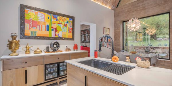 A fragrant garden of desert plants and herbs, designed to attract hummingbirds, borders the patios beside a papyrus-and-bamboo fishpond. Beyond the stone wall, native trees rise gently to the mountain’s base, completing the seamless union of architecture and nature.
