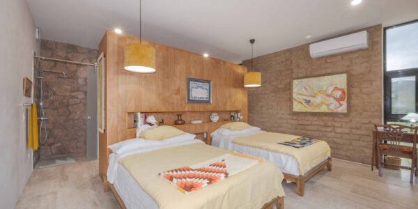 La suite principal, la Sala Atardecer, presenta una relajante paleta de rosas e incluye dos camas matrimoniales. Cinco metros de ventanas orientadas al oeste se inclinan hacia arriba para enmarcar las vistas celestiales y a la montaña. El baño incluye un inodoro inteligente y una ducha con mosaicos de pasta de mediados de siglo. Una oficina privada con paredes de adobe, techo de tejamanil y vistas a la montaña, se encuentra junto a la suite.
