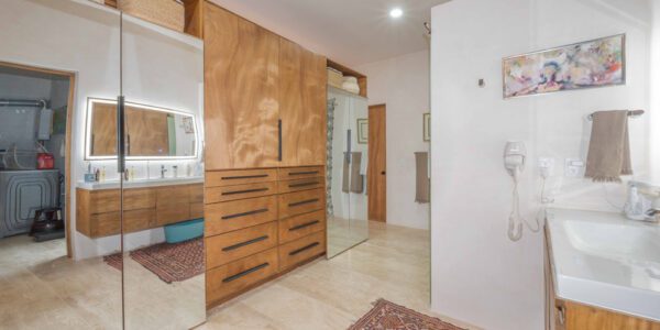 En el extremo opuesto del pasillo se encuentra una segunda oficina con techo de tejamanil y vistas al patio, junto a un baño donde una cómoda morijang coreana sirve de armario. Un tocador con lavabo de piedra negra y un inodoro Toto. Las puertas dobles se abren al garaje y a una sala de máquinas que alberga el calentador de agua, el sistema de filtración y el equipo solar.